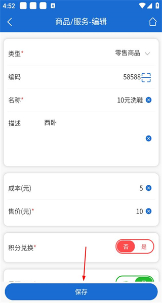 3、进入10元洗鞋的商品编辑界面,核对好相关信息后,点击页面底部的保存按钮,即可完成该商品的信息配置。