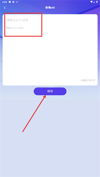 2、进入“新增wifi”页面,输入wifi名称和密码后,点击【保存】按钮,即可完成wifi信息的添加。