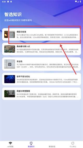 3、切换到“智选知识”页面,挑选【频段与标准】这类wifi相关的知识条目,查看具体内容。