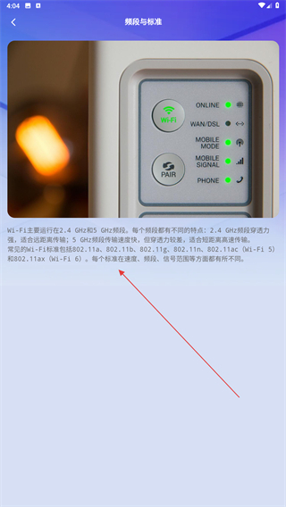4、进入“频段与标准”详情页面,能够知晓2.4GHz、5GHz频段的特性以及常见Wi-Fi标准之间的区别。