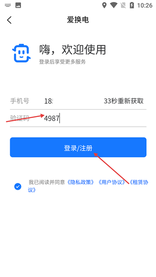4、填写好手机号和验证码后,确认已勾选协议,点击【登录/注册】按钮,就能完成账号登录并使用服务。