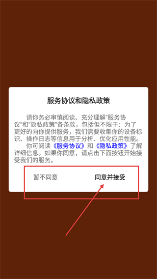 1、进入【服务协议和隐私政策】页面时,需要先仔细阅读相关条款内容,若您同意这些条款,就点击【同意并接受】按钮,这样才能继续使用服务。