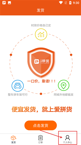 在【发货】页面,你可以了解到【i拼货】的发货特点;要是想使用和个人相关的功能,点击底部的【个人中心】选项就能跳转过去啦。