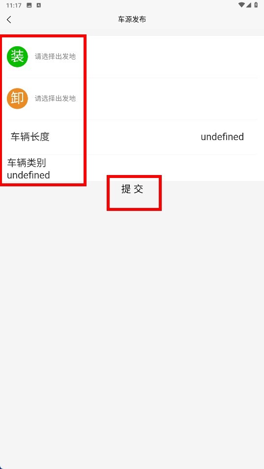 4、进入车源发布页面后,依次填写出发地(装/卸)、车辆长度、车辆类别等相关信息,确认无误后点击【提交】按钮,即可完成车源信息的发布。