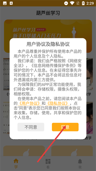 在葫芦丝学习应用弹出的用户协议与隐私协议窗口里,仔细阅读相关条款后,点击【同意】按钮,即可继续进行应用的使用流程。