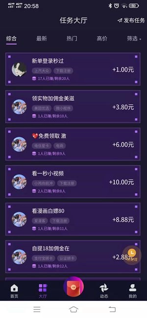 1、新用户注册后,最高能领取188元的新人福利,而且平台上的任务类型十分丰富。