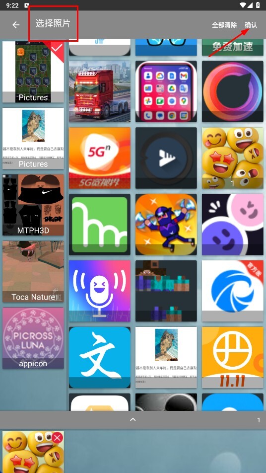 2、进入选择照片的页面后,先勾选需要的照片,再点击【确认-功能按钮】。