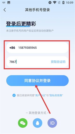 4、进入【其他手机号码登录】页面后,输入对应的手机号和验证码,勾选相关协议,随后点击【同意协议并登录】按钮,即可完成登录操作。