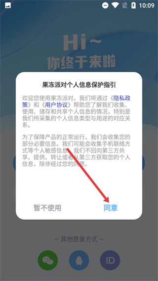 1、仔细阅读【果冻派对个人信息保护指引】,在充分了解《隐私政策》与《用户协议》的内容后,点击【同意】按钮以继续后续操作。