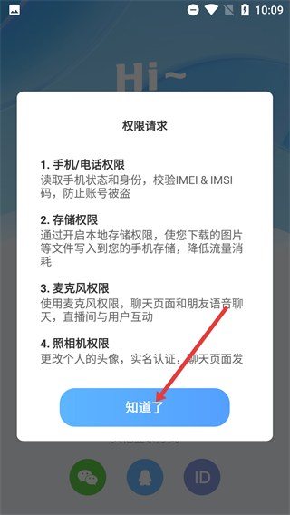 2、在【权限请求】弹窗里,查看手机/电话、存储等权限的相关说明,点击【知道了】按钮,即可进入权限授权的流程。