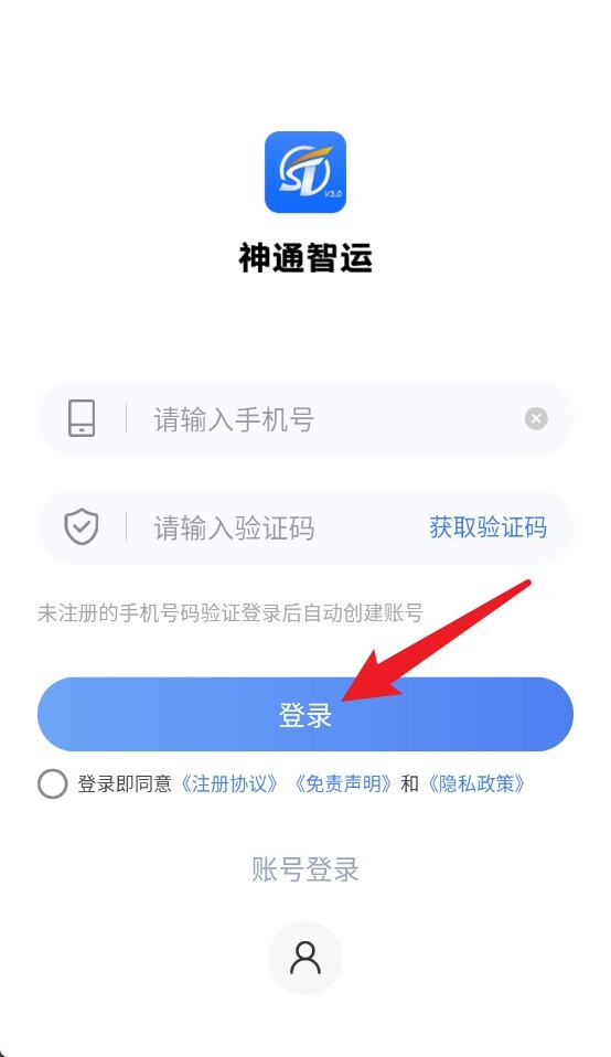 1、启动神通智运App,输入手机号并填写验证码,随后点击“登录”按钮,就能迅速进入系统。