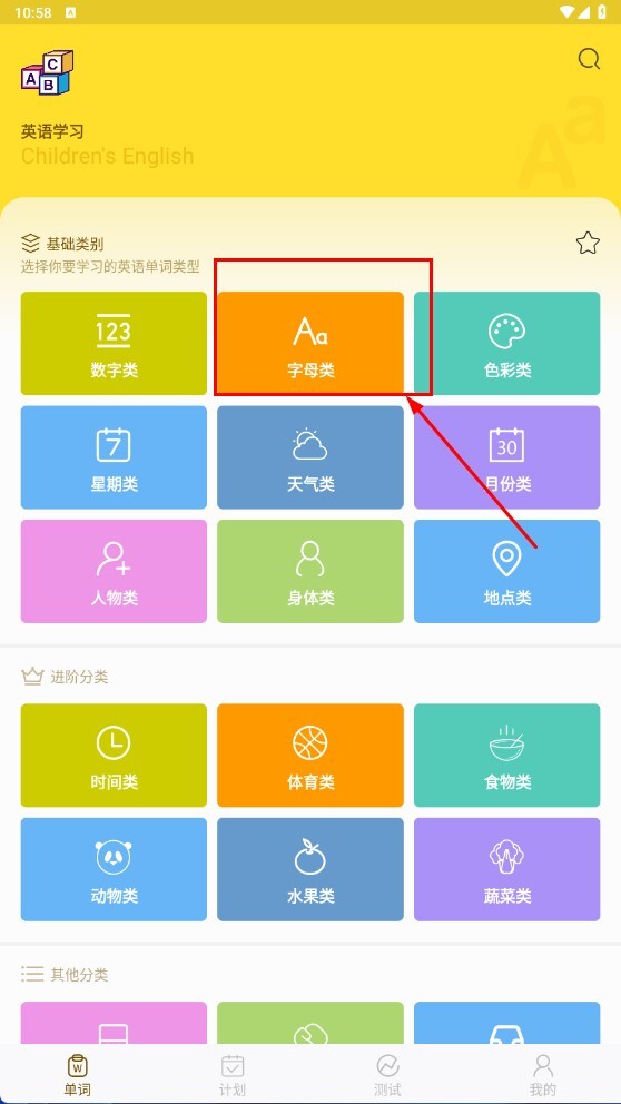 1、进入英语学习页面后,点击【字母类-单词类型按钮】,即可进入字母学习界面。