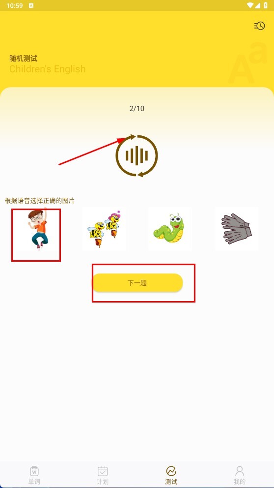 4、点击底部的【测试-功能按钮】,进入随机测试页面,根据语音提示选择正确的图片,然后点击【下一题-功能按钮】继续进行测试。