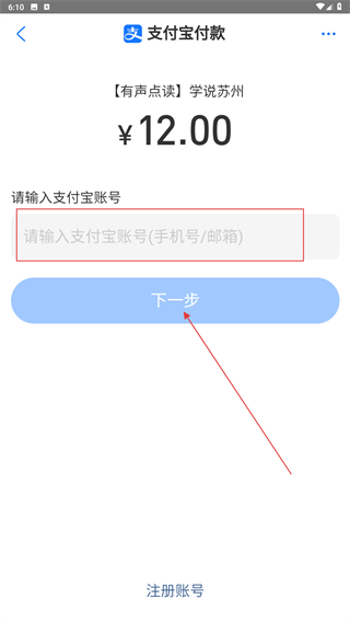 4、进入支付宝的付款页面后,输入对应的支付宝账号(可以是手机号或者邮箱),接着点击【下一步】按钮,以此完成整个支付流程。