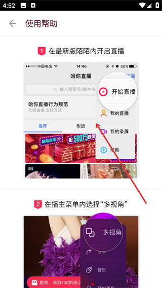 1、在【陌陌直播助手】界面中,点击底部的【使用帮助】按钮,就能查看该工具的操作指引内容。