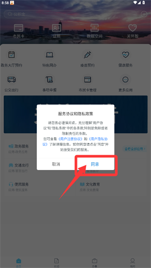 启动应用后,请仔细阅读服务协议和隐私政策,确认无误后点击同意按钮。