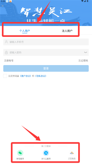 2、登录界面支持选择个人、法人用户类型,也能通过第三方账号登录。