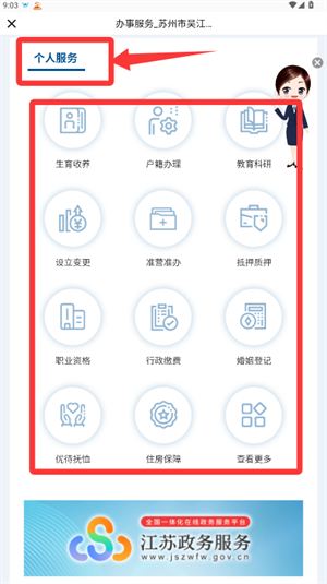 4、进入个人服务页面后,可根据需求选择生育收养、户籍办理等具体事项来办理相关业务。