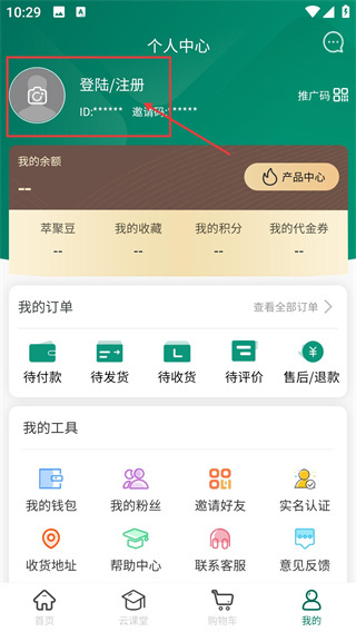 2、进入个人中心页面后,点击【登录/注册】板块,即可跳转至登录注册界面。