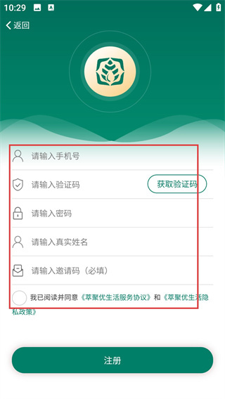 4、进入注册界面后,按顺序填写手机号、验证码、密码、真实姓名和邀请码,随后点击【注册】按钮,就能完成注册流程。