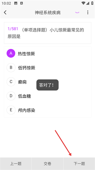 4、当作答正确后,界面会弹出【答对了!】的提示,这时你可以点击【下一题】按钮,继续进行章节练习。
