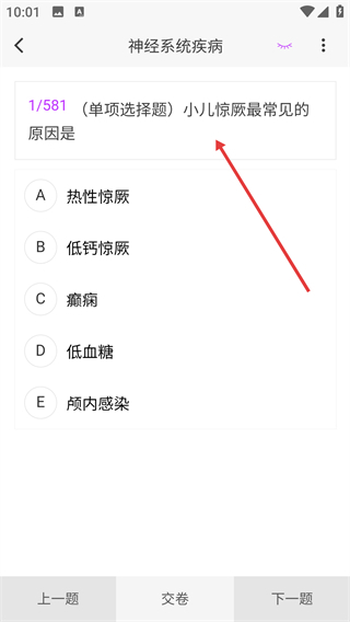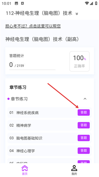 2、在科目主界面中,找到【章节练习】模块里对应的具体章节(例如【01-神经系统疾病】),点击该章节右侧的【答题】按钮,即可进入练习页面。