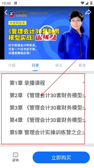 4、进入课程详情页后,点击切换至【目录】标签,就能看到【第1章-录播课程】等各个章节的具体安排,从而清晰了解课程的整体内容结构。