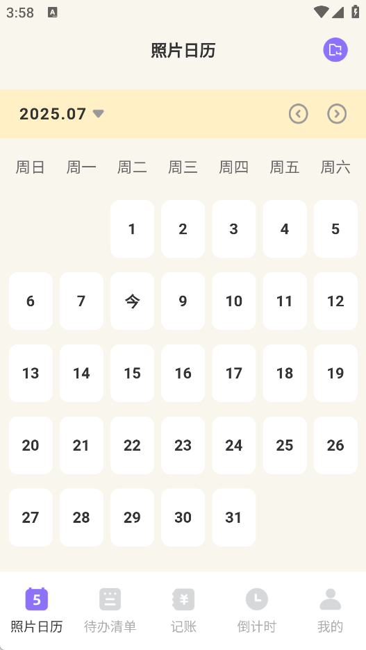 1、在照片日历页面,你能依据不同日期添加对应的照片,便于轻松管理。