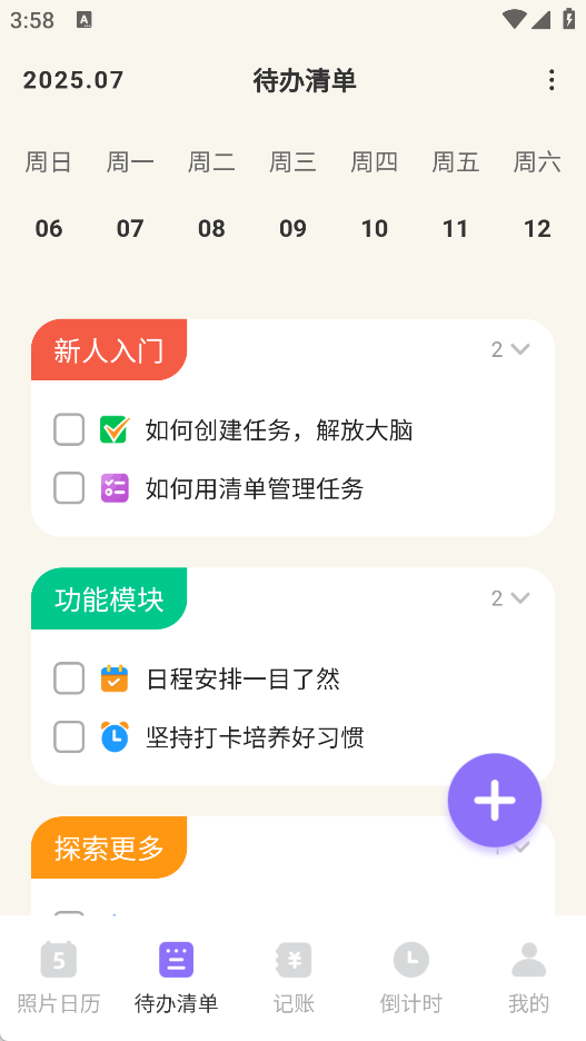 在待办清单里,你能随时点击“+”号添加各类待办事项,另外还有新手引导、功能模块以及更多探索等功能选项。