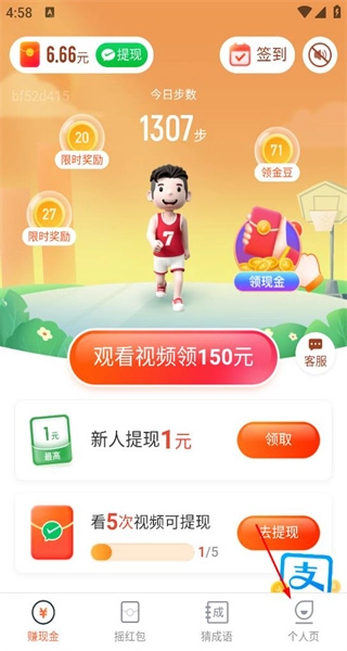 1、进入哈喽计步的主界面后,能看到今日步数为1307步以及对应的现金奖励,界面底部设有多个功能操作选项,点击“个人页”即可进入相应的页面。