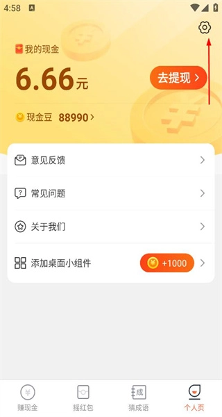 2、界面上会展示我的现金及现金豆数量,还设有意见反馈、常见问题等功能,点击设置图标选项即可。