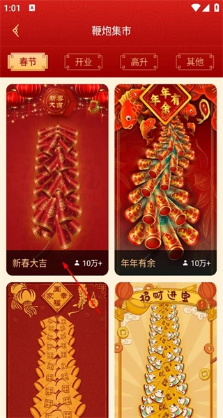 打开软件后,界面会呈现吉祥鞭炮的展示内容以及“点火集市”按钮,点击该集市按钮,即可进入鞭炮集市的分类页面。