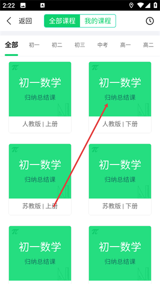 2、在课程分类页面挑选目标教材版本(例如【初一数学-人教版-下册】),随后进入该版本对应的课程列表页面。