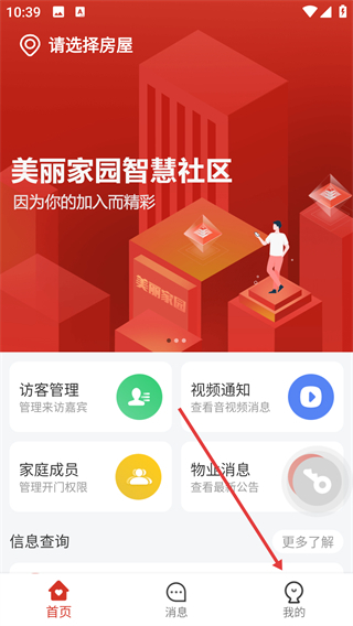 1、打开【美丽家园智慧社区】,在首页找到底部导航栏的【我的】按钮并点击,即可进入个人相关操作界面。