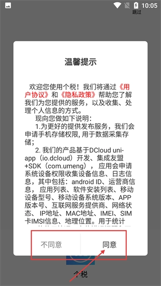 1、进入个税应用后,会弹出包含【用户协议】与【隐私政策】的温馨提示,阅读完毕点击【同意】按钮,就能进入软件使用相关功能。
