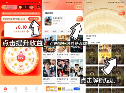 试试在抽奖前先看几个能提升收益的广告,之后每抽一次奖就看一个提升收益悬浮球的广告,接着再看一个解锁短剧的广告,这样提高收益的概率会比较大。