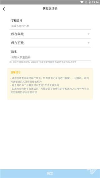 4、用户点击“获取激活码”后,输入孩子所在学校的相关信息以及班级和年级,就能成功获取激活码。
