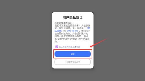 1、点击同意按钮,阅读并确认隐私协议。