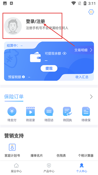 1、在展业中心页面,点击底部的【个人中心】按钮,即可进入个人中心界面。该界面涵盖订单管理、收入结算等功能,同时也提供保险产品查询等相关服务。