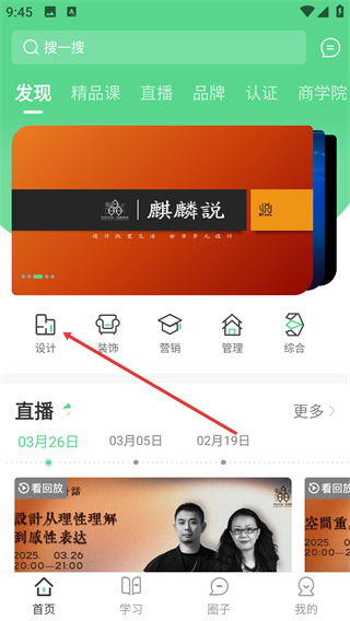 1、在首页点击【设计】分类选项,进入设计类课程的列表页面,即可查看相关课程资源。