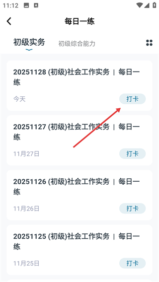 4、在每日一练的列表里,找到当天对应的练习任务(例如【20251128(初级)社会工作实务|每日一练】),点击【打卡】按钮即可启动练习。