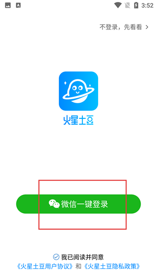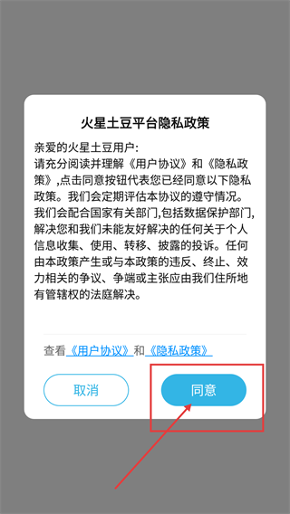 1、在阅读《火星土豆平台-隐私政策》与《用户协议》后,点击“同意”按钮,就能进入应用后续的操作流程。