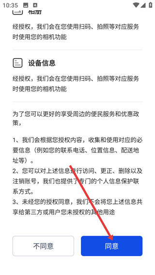 在软件的隐私与权限提示页面,点击【同意】按钮,以此接受相关服务条款和隐私政策。