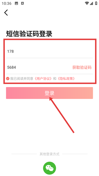 2、进入短信验证码登录界面,填写手机号与验证码,勾选同意《用户协议》和《隐私政策》后,点击【登录】按钮即可完成账号登录操作。