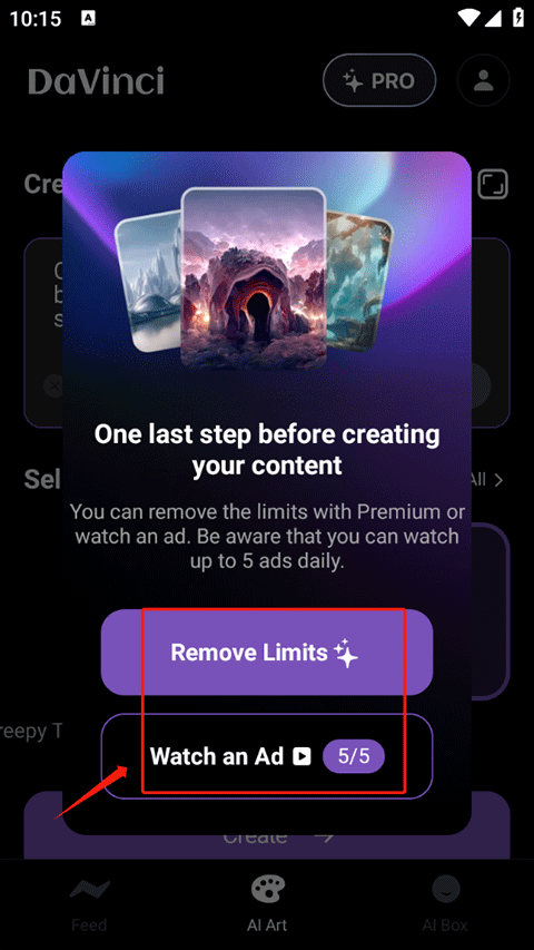 4、若你已充值会员,可点击“Remove Limits”生成;若未充值,则点击下方的观看广告来获取
