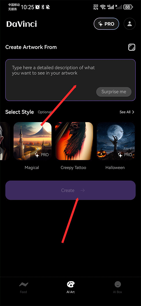 3、点击后会跳转至AI Art界面,之后在上方的文本框里输入您想要在艺术作品中呈现的详细描述,再点击create按钮。