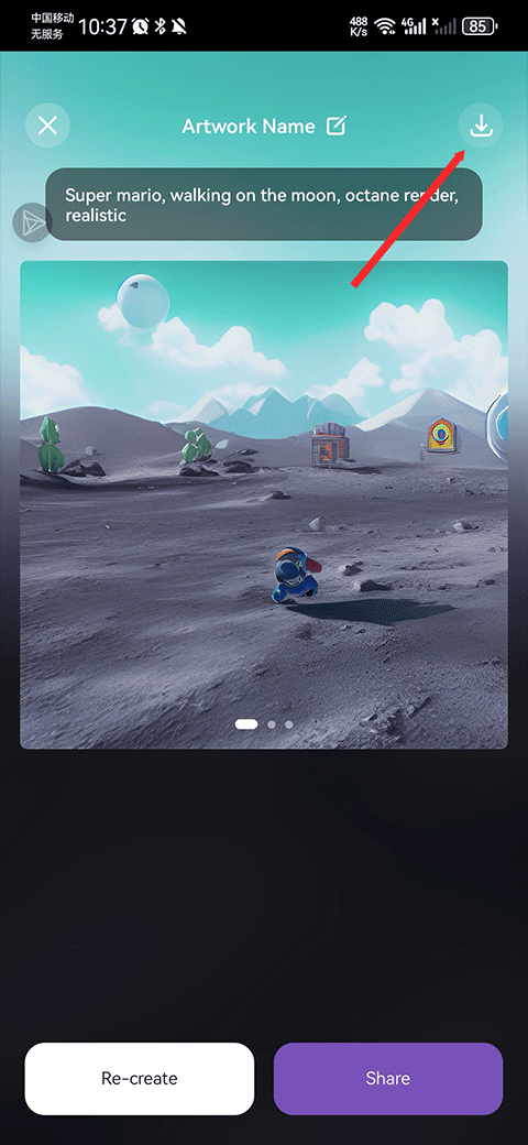 5、最后软件会为你生成AI图片,要是觉得满意,点击右上角的按钮就能把图片保存到相册里啦