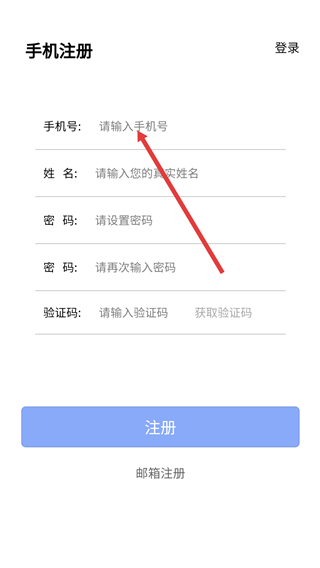 4、进入【手机注册】页面后,按顺序填写手机号、姓名、密码等相关信息,获取并输入验证码,之后点击【注册】按钮,即可完成账号注册操作。