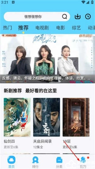 软件提供了实时弹幕功能,与其他观众实时交流,增加观影乐趣。1、打开星辰视频后,在首页的新剧推荐区域,点击右下角的【我的】按钮