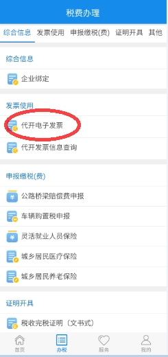 2、接着在弹出的新页面里,找到办税功能板块,点击其中的代开电子发票选项。